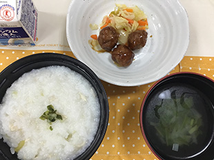 ・中華粥 黒酢の肉だんご 野菜炒め 牛乳
