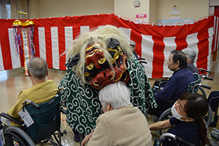 「残堀はやしれんさんによる獅子舞」「山本さん蓬田さん小暮さんによる餅つき」「ご利用者様のカラオケ大会」や「職員による相撲大会」が盛大に行われました。