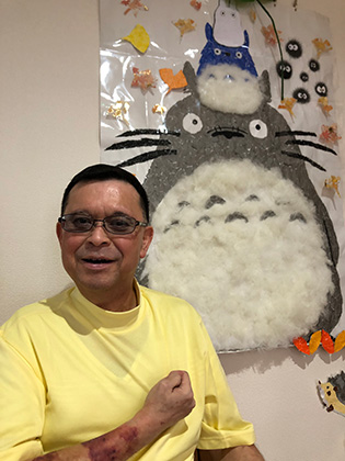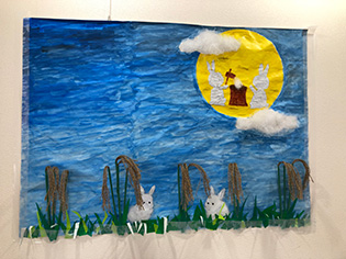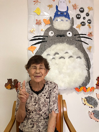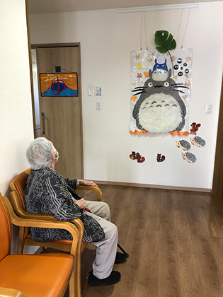 今月より秋の壁画作品となりました。トトロのお腹部分はふわふわとした綿を敷き詰めました。
