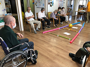 今月は新しいレクリエーションで“落とし穴ボール”と“新聞落としゲーム”を行ないました。新聞落としではうちわを用いて新聞を落とすゲームで、うちわで涼みながら行なうはずが、新聞を落とす事に白熱しました。
