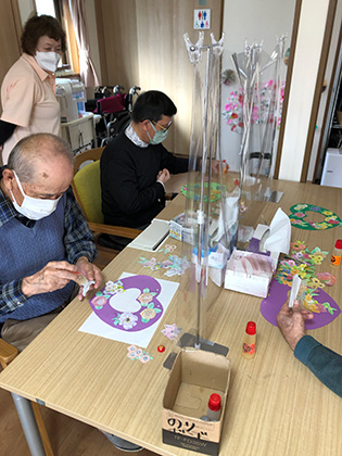 段々と春めいてきて暖かくなってきました。施設内では『花植え競争』を行ない、華やかなレクリエーションを行ないました。16本の花を16か所の穴に差し、タイムを競うレクリエーションです。