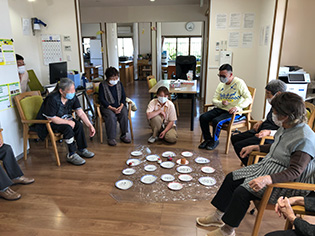 月に1回のペースで新しいレクリエーションを取り入れています。今月は紙皿に得点を書き、高得点の紙皿を目掛けてお手玉を投げる【お手玉乗せゲーム】を行ないました。初めて行うゲームでしたが、とても盛り上がっていました。