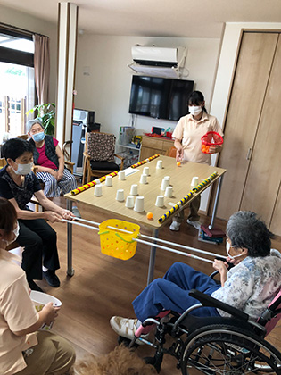 今月の新しいレクリエーションは、ボール掴みゲームとお餅焼きゲームです。