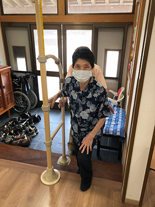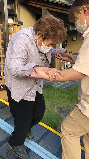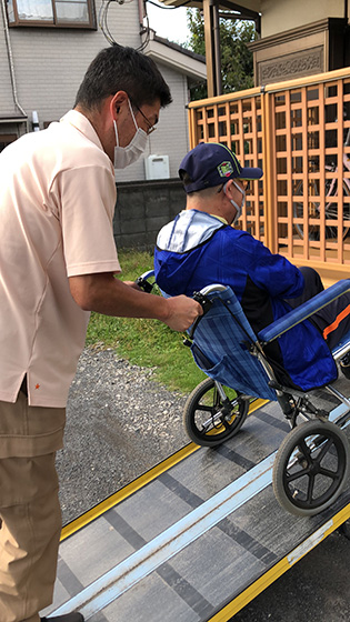 11日に施設内防災訓練を行ないました。普段出入りしている玄関ではなく、ベランダからスロープを使い、普段は階段で降りている方も、車椅子に乗車して非難しました。