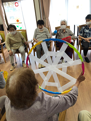 今月の新しいレクリエーションは『フラフープキャッチ』です。フラフープにテープをくもの巣状に張り、ボールを投げてキャッチして多く貼り付けられたペアが勝利です。