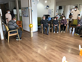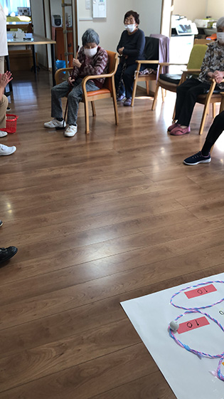 今月の新しいレクリエーションは『紙皿運試し(ボール転がし)』です。紙皿には得点が書いてあり、ボールを転がし得点を競いました。今回は1名だけ500点の紙皿に乗せる事が出来ました。