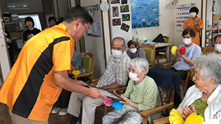 今月は新しいレクリエーションで“落とし穴ボール”と“新聞落としゲーム”を行ないました。新聞落としではうちわを用いて新聞を落とすゲームで、うちわで涼みながら行なうはずが、新聞を落とす事に白熱しました。