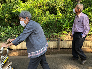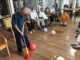 今月は新しいレクリエーションで“落とし穴ボール”と“新聞落としゲーム”を行ないました。新聞落としではうちわを用いて新聞を落とすゲームで、うちわで涼みながら行なうはずが、新聞を落とす事に白熱しました。
